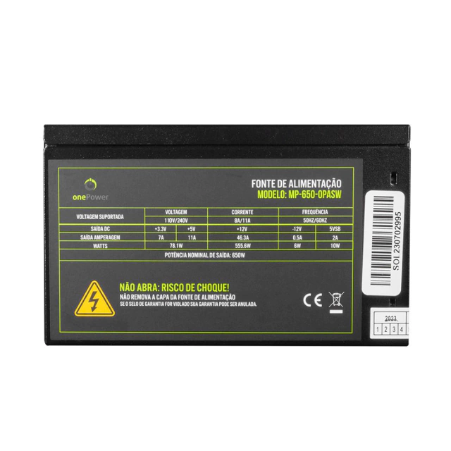 - A fonte one power MP-650-OPASW conta com bivolt automático, podendo trabalhar entre 110v a 240v, com fan de 120mm ela mantém seu sistema interno em boas temperaturas, alinhado a um baixo ruído.